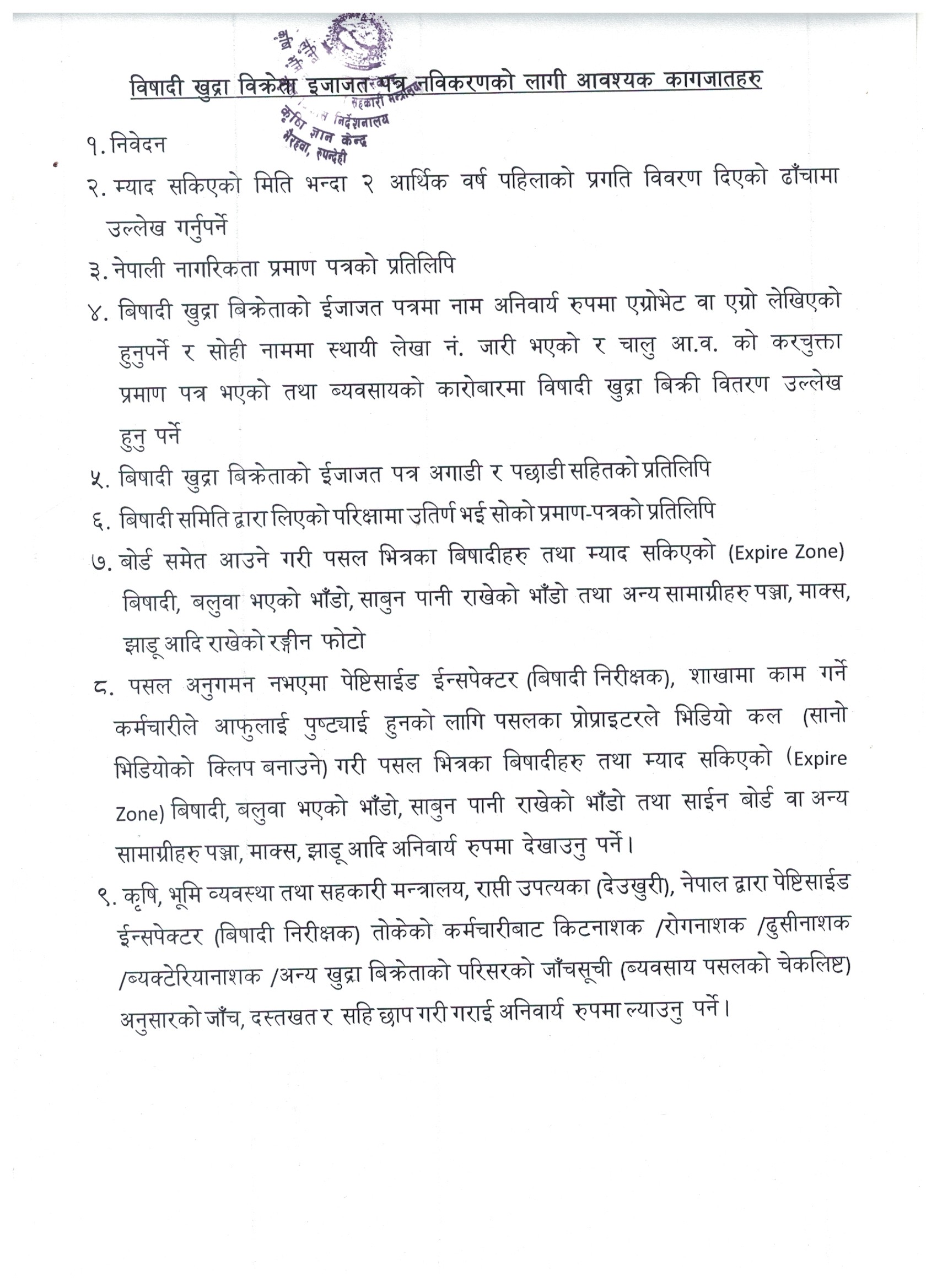 विषादी खुद्रा विक्रेता इजाजत पत्र नविकरणको लागि आवश्यक कागजातहरु